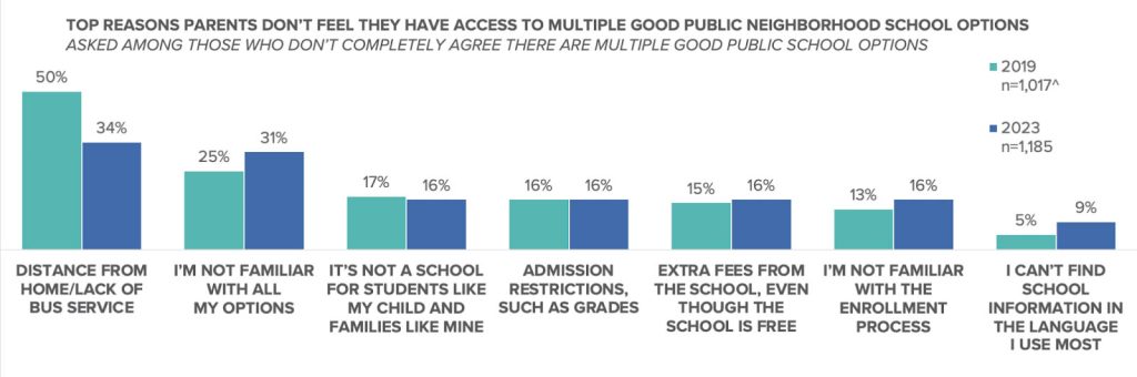 Among the parents who do not agree there are multiple good public schools available to them, many expressed facing challenges related to lack of proximity or transportation to good school options, as well as lack of familiarity with their options. Others encountered challenges due to complex enrollment processes or language barriers.