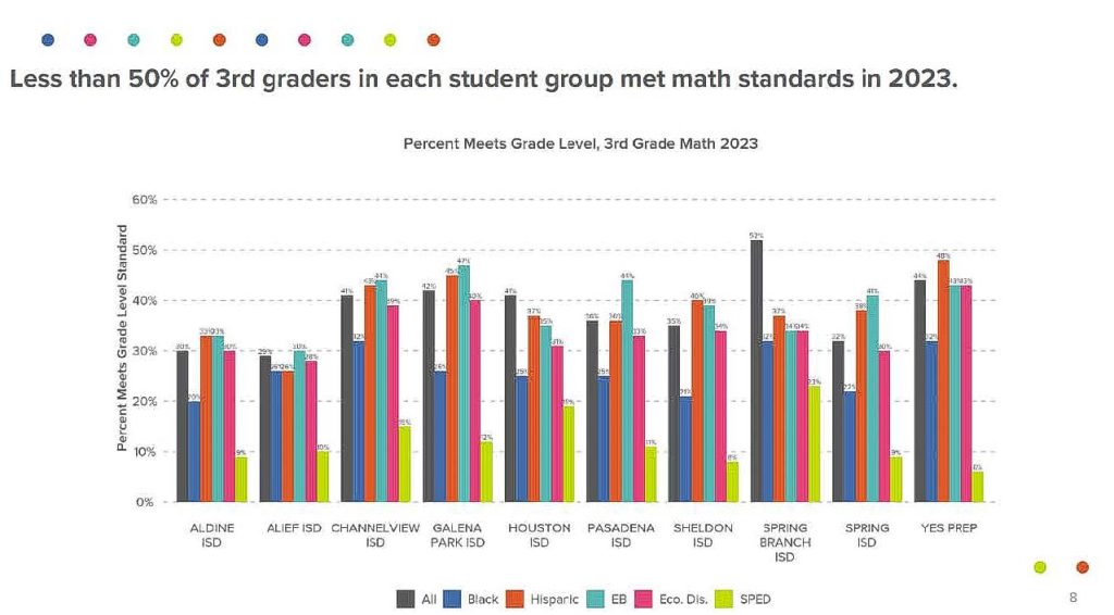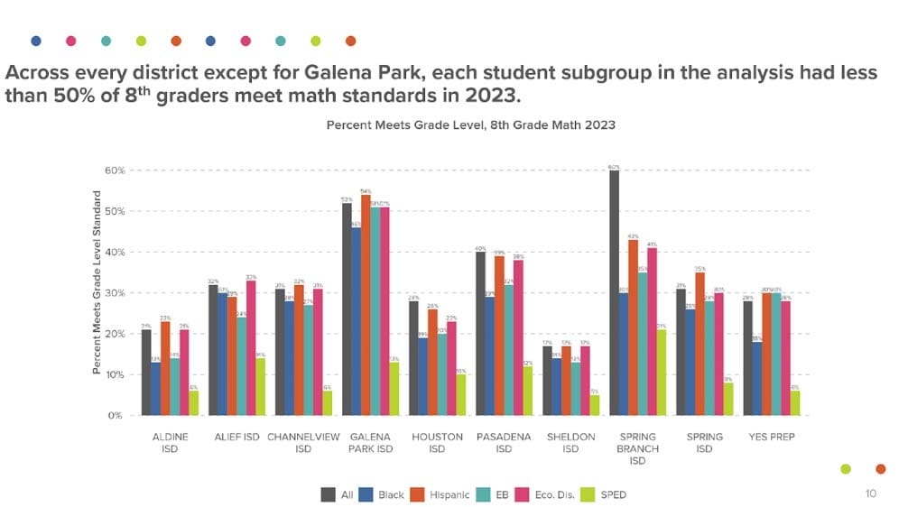 Across every district except for Galena Park, each targeted student population in the analysis had less than 50% of 8th graders meet math standards in 2023.