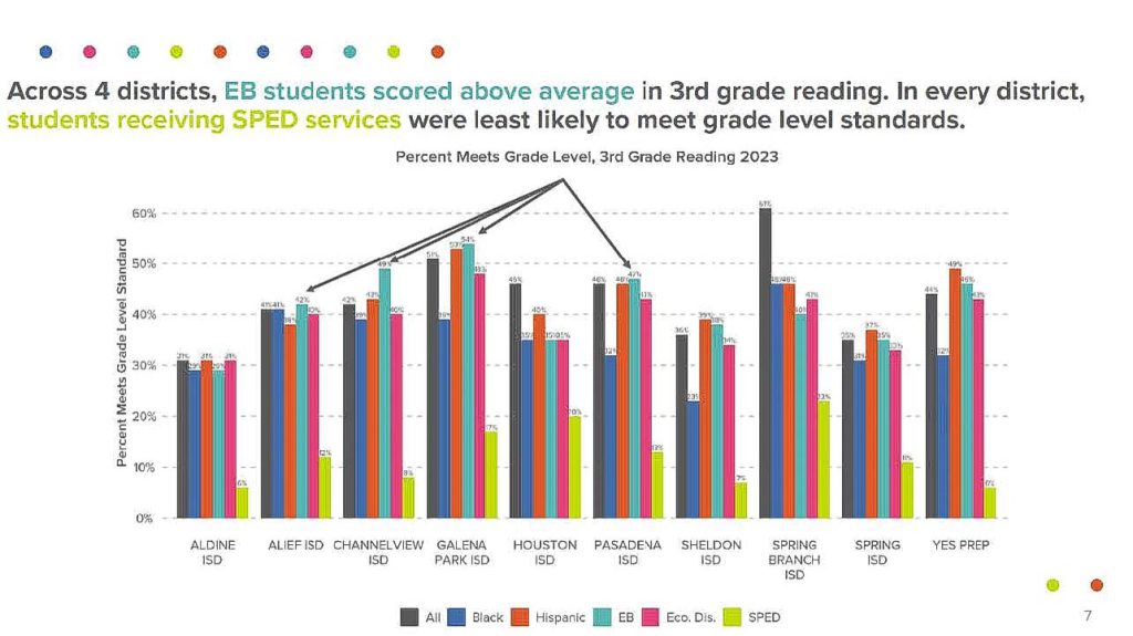 - In 3rd grade, emergent bilingual students (EB) often score among the highest across student groups in Houston region districts, but those who are still classified as EB in 8th grade and high school do not perform as well as students from other groups.