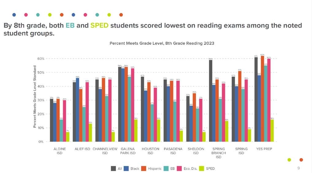 By 8th grade, both EB and SPED students scored lowest on reading exams among the noted student populations.