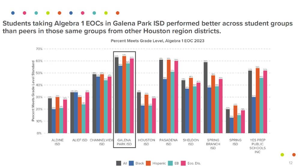 Students taking Algebra 1 EOCs in Galena Park ISD performed better across student groups than peers in those same groups from other Houston region districts.