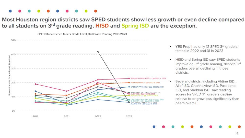 Most Houston region districts saw SPED students show less growth or even decline compared to all students on 3rd grade reading. HISD and Spring ISD are the exceptions.