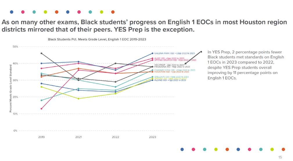 As on many other exams, Black students’ progress on English 1 EOCs in most Houston region districts mirrored that of their peers. YES Prep is the exception.