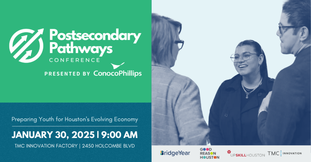 Good Reason Houston is proud to cohost the Postsecondary Pathways Conference with BridgeYear and UpSkill Houston on January 30. This event will bring together education and workforce leaders to strategize on building stronger pipelines between schools and career readiness.