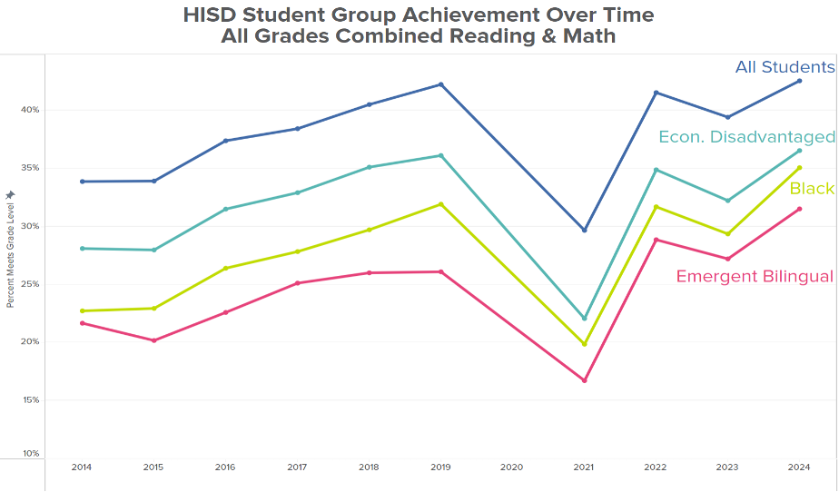 When combined, Houston ISD reading and math proficiency for all students is at its highest levels since at least 2014. Black, Economically Disadvantaged, and Emergent Bilingual student populations put up the highest rates of proficiency recorded in at least a decade.