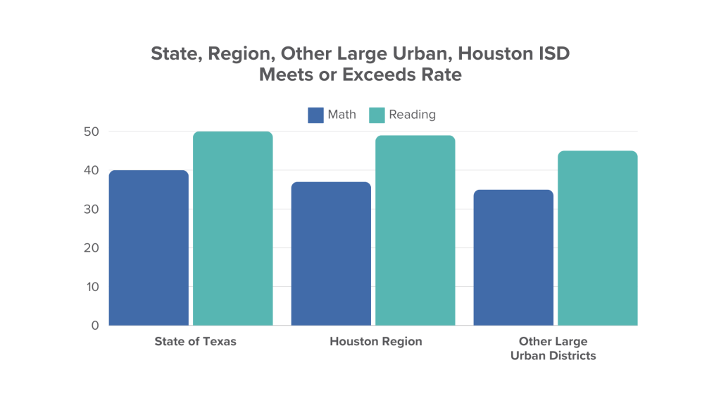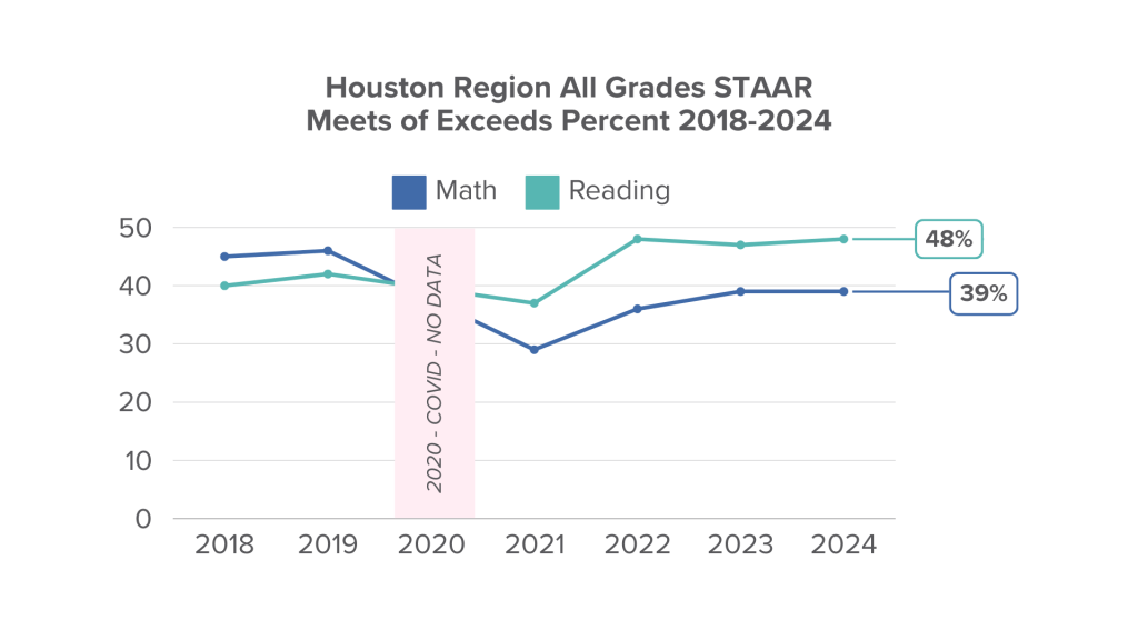 Across the region, math proficiency rates remain a critical challenge, with 6 out of 10 students across all grades not meeting grade-level standards. That means 194,000 students in the Houston region are not on grade level in math today. Math performance in Houston and across Texas remains well below pre-pandemic levels, highlighting the important work ahead to set our students up for long-term success.