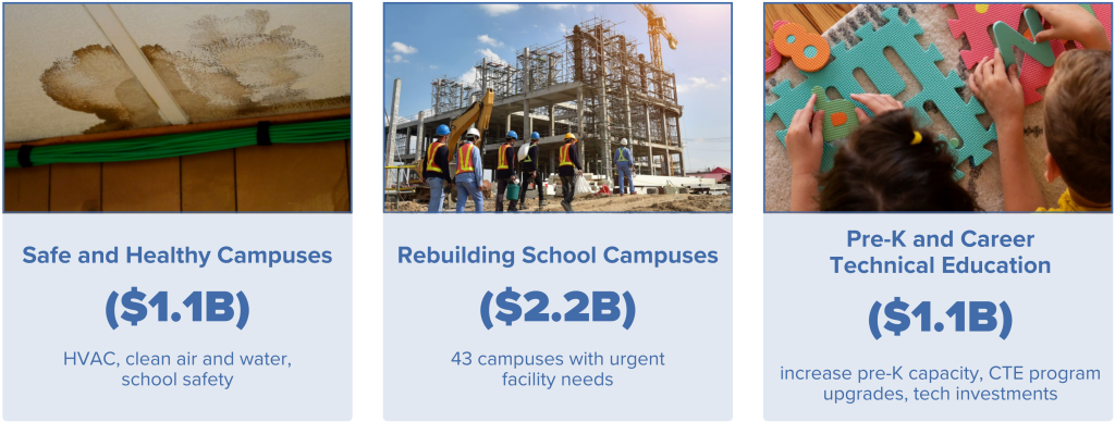 The bond will be used towards 40+ schools to address urgent needs like clean water, updated HVAC systems, and increased school safety. It also includes funding for career and technical education, student technology, and pre-kindergarten programs.