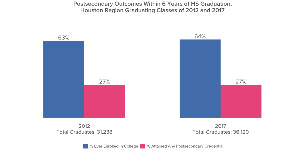 - College enrollment and postsecondary credential attainment didn’t change much from 2012 to 2017. Across the Houston region, typically right around 60% of high school graduates enrolled in college within six years of high school graduation for each of the classes of 2012 to 2017. Only 27-28% of graduates from each of those classes attained some type of postsecondary credential within six years. Postsecondary credentials include professional certifications, associate’s degrees, and bachelor’s degrees.