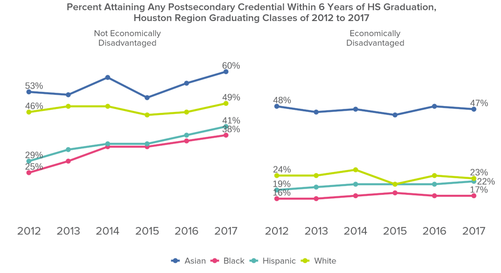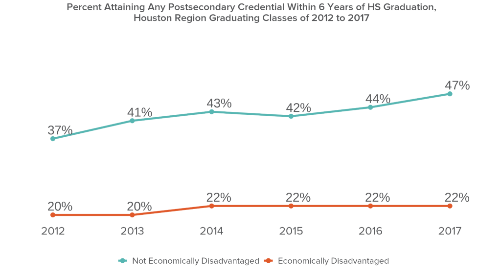 - There were, however, very different trajectories for students from different economic circumstances. Students from economically disadvantaged backgrounds saw only a 2-point increase in the likelihood of attaining a postsecondary credential between the classes of 2012 to 2017, from 20% to 22%. Students from more affluent backgrounds, on the other hand, were 11 points more likely to attain credentials, up to 40% in 2017 from 29% in 2012. This trend is covered up when looking only at credential attainment for all graduates because students from economically disadvantaged backgrounds make up the vast majority of Houston-region graduates, so their numbers drive the overall trend described above.