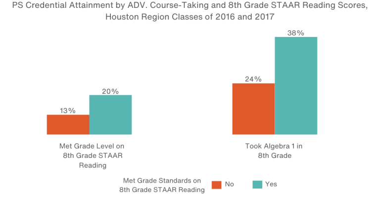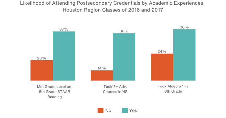 1. Houston-region graduates with rigorous academic experiences in middle and high school–taking Algebra 1 in 8th grade, meeting grade level standards on 8th-grade STAAR reading tests, or taking five or more advanced courses in high school–are far more likely to attain postsecondary credentials. Combining multiple rigorous academic experiences gave graduates the best chance of credential attainment.