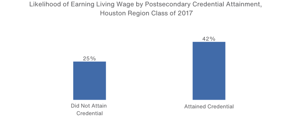 Our November ConnectEd showed that 2017 graduates with a postsecondary credential were far more likely to earn a living wage six years after high school than those without one. Our new report affirms and enhances these findings. Even accounting for student demographics and socioeconomic status, holding a postsecondary credential emerged as the strongest predictor of earning a living wage—defined in 2023 as $42,158 for a single earner with no dependents in Harris County.