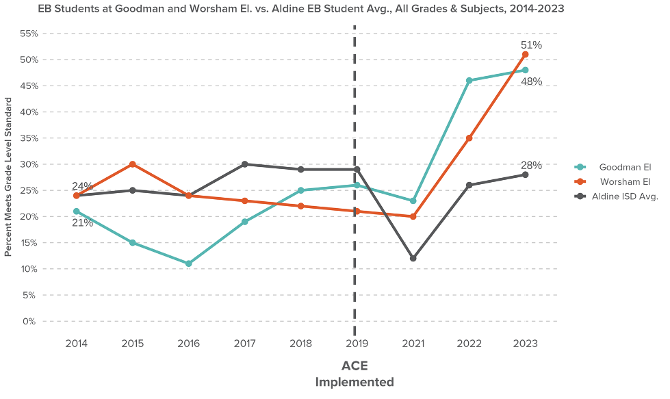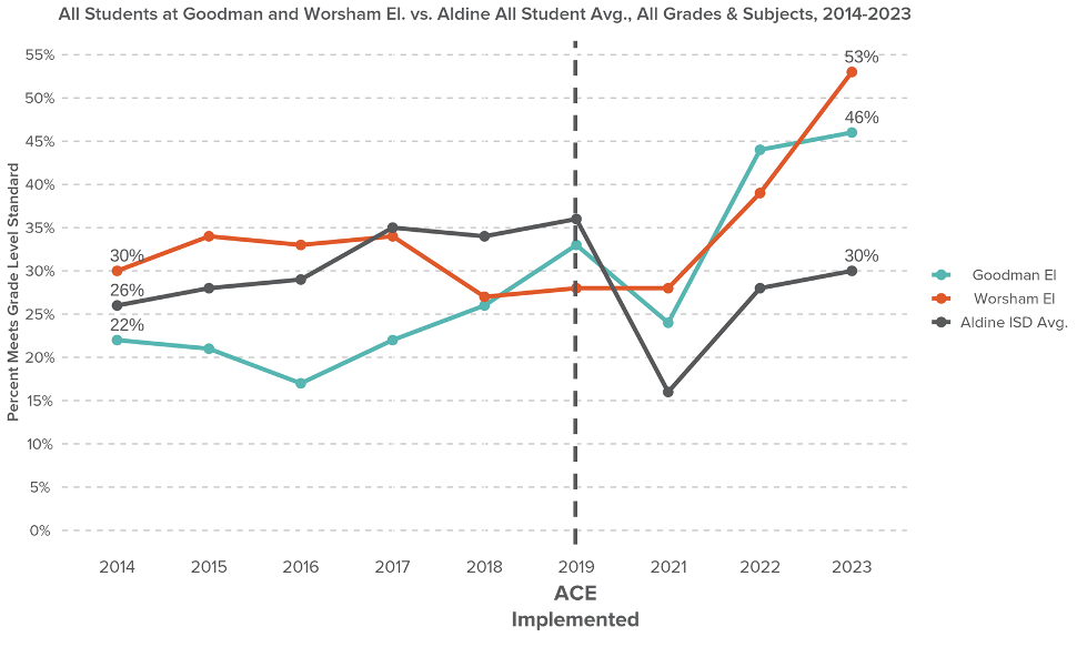 As seen in the graph below, prior to the implementation of ACE in 2019, Goodman and Worsham typically saw students scoring the same as or worse than those elsewhere in Aldine ISD. Since 2019, however, these two campuses have seen tremendous growth on State of Texas Assessments of Academic Readiness (STAAR) exams compared to the rest of the district.