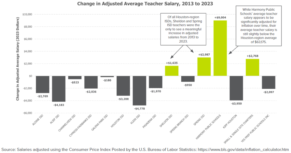In June 2019, the Texas Legislature passed House Bill 3, which, among other things, established the Teacher Incentive Allotment (TIA). Districts across the state can apply for TIA to provide additional funding to boost the salaries of the district’s highest performing teachers, particularly those serving at high-need campuses. Aldine ISD applied for and was approved as a TIA district starting with the 2022-2023 school year. Since then, the district has pulled down significant additional funding from the state. This funding incentivizes the most impactful educators to teach at the schools which need their talents most. Increasing teacher salaries in Aldine ISD–particularly in high-need schools–is especially imperative, given that inflation-adjusted teacher salaries fell in the district from 2013 to 2023 by nearly $2,800, as seen in the graph below.