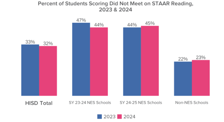STAAR READING: Improvements were more muted on STAAR reading, with only a 1-point decline in students scoring Did Not Meet across HISD. Like with math, though, students at NES campuses outpaced the district overall, seeing a 3-point drop in students scoring Did Not Meet.