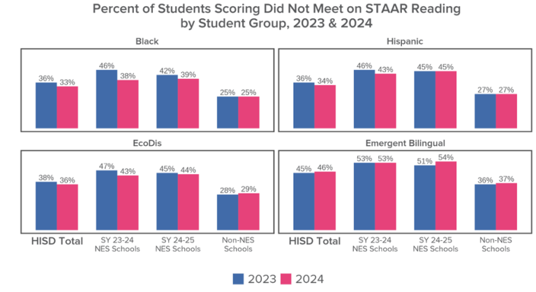 - Looking at particular student groups, Black, Hispanic, and economically disadvantaged students at NES campuses saw even larger gains, especially in math.Keep reading for a comprehensive perspective on Houston public education data.