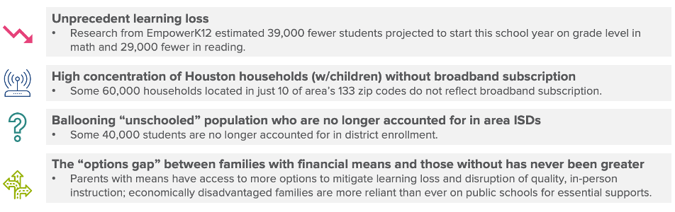 Preliminary estimates of learning loss paint a dire picture of the impact of the pandemic to-date. Many of our most at-risk students are falling further behind during this time due to new barriers such as lack of access to the internet. Also, districts are reporting that tens of thousands of students have simply vanished from area enrollment, and that many students who are enrolled are attending so infrequently that they are at risk of failing one or more classes this school year. Conversely, families with financial means and digital access are finding avenues to support their child’s learning to keep them on track, widening the education gap.