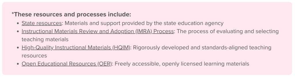 - Greater emphasis on, and utilization of, state-provided instructional materials;