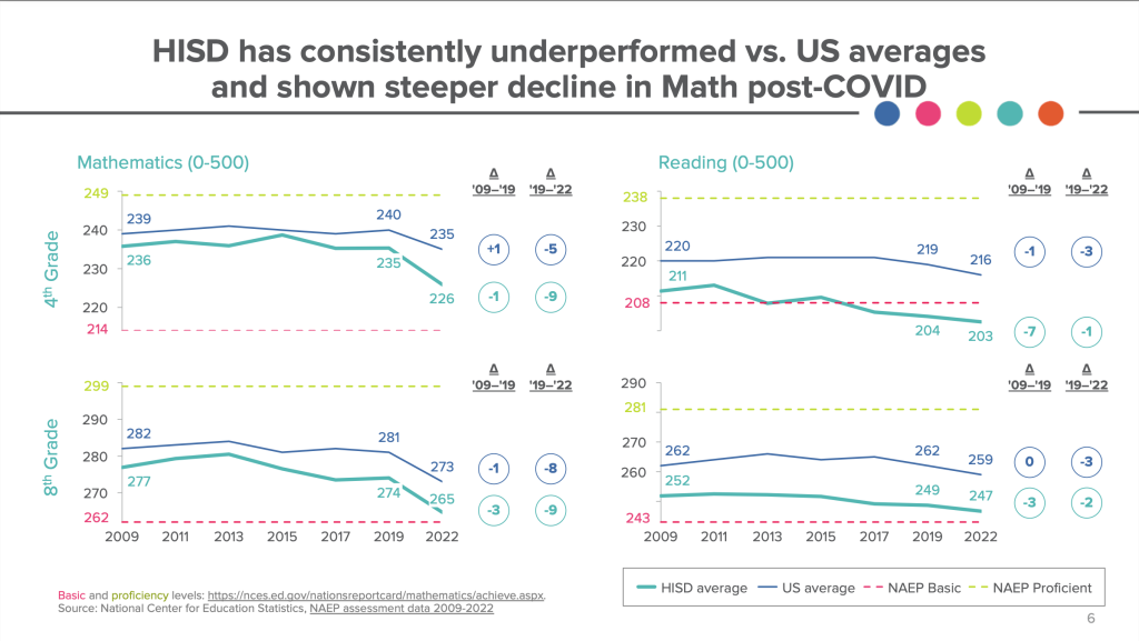 The results from NAEP tell us that it’s critical that we continue to focus on raising the bar of rigor and addressing learning loss in both math and reading. When looking at nationally normed tests, reading scores are abysmal, and this could mean Houston students are largely not graduating with the right skills for postsecondary and career success. Good Reason Houston believes that more intensive focus on supporting historically marginalized student populations is needed to ensure equitable access to high-quality schools for all kids.